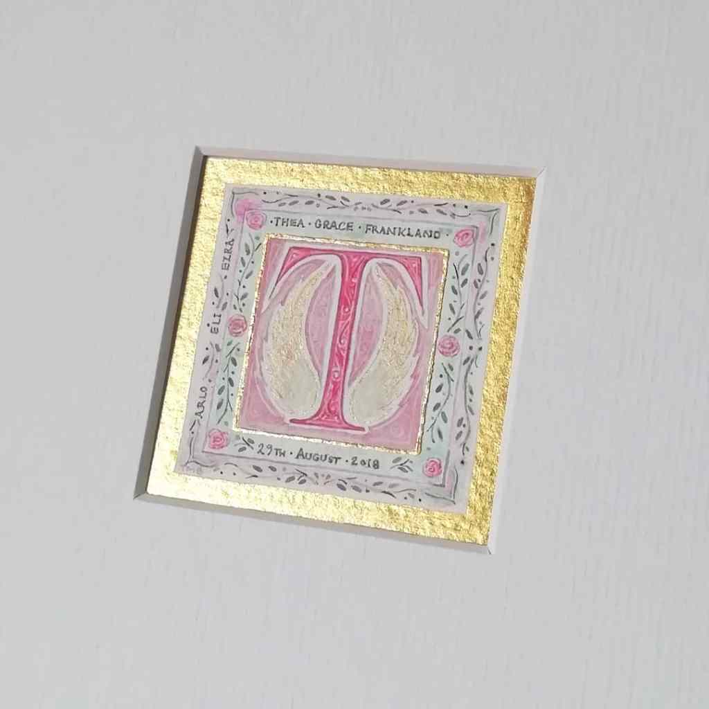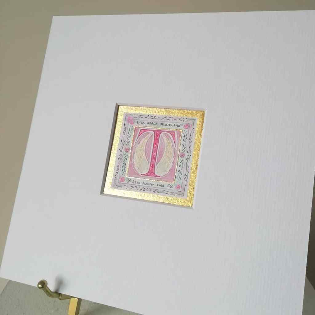 Pinks were requested for this little commemorative painting. If you look closely her brothers’ names are added in the left panel. This felt very special to do. I wanted to get it right. A photograph of a pink rose was sent, her pink rose and it seemed to guide me. Angels wings were requested also. I loved doing it. It’s a privilege to be asked to work on something like this. I think they loved it!