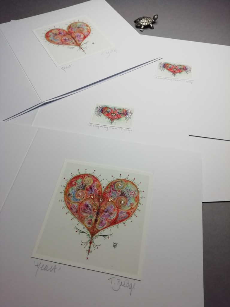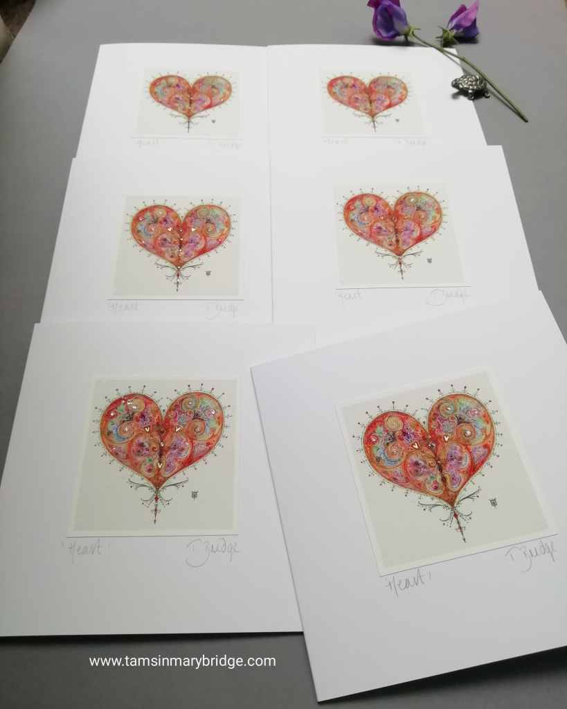 I’ve just completed some Heart cards requested for Diana Marten’s gallery in Ludlow. They don’t have to be used for Valentines, and of course they can be ordered through the etsy shop, too. They are priced similarly.