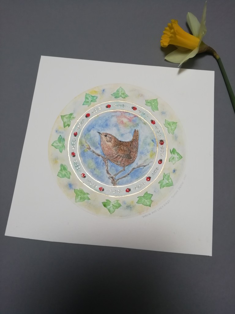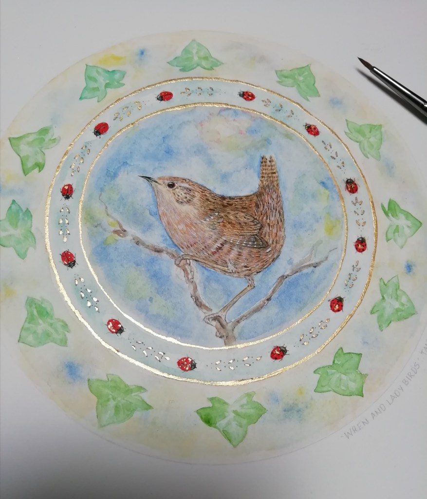 The tiny Wren is the most common bird in the UK – something I hadn’t known until exploring further for this painting. He is kept company by Ladybirds and ivy, which they often nest behind.