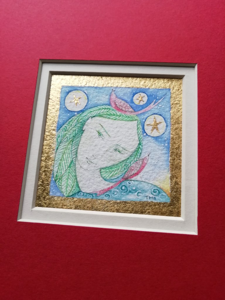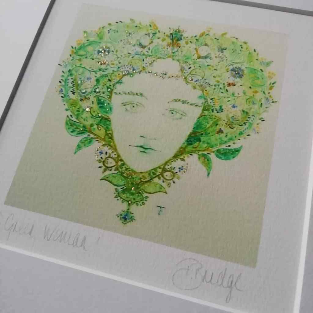 The original of this painting has another story. She hung in an exhibition in the art centre in Aberystwyth University in Wales, probably about 2003 or 4. Very sadly she was taken. I was hurt at the time but I decided to be flattered by this theft instead. Someone wanted her and so I imagine they care for her. I’ve always wondered where she is now and does she have a good home though. Somehow re-doing her as an archival print and painting over her with a little gold detail keeps bringing her back to life for me. Just what any green lady should be doing ππ If you’ve read this far, have a lovely day all the green ladies, and men out there … . πΏ